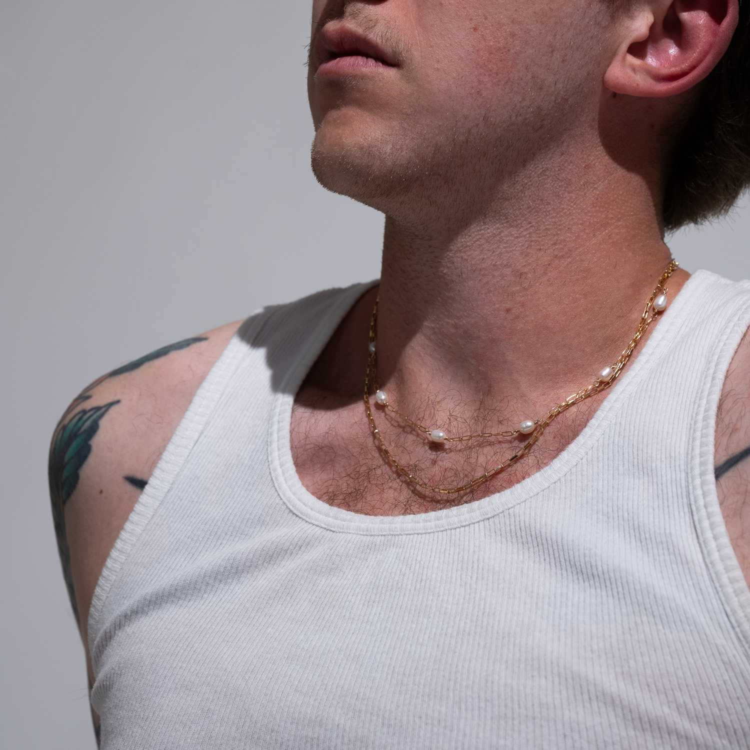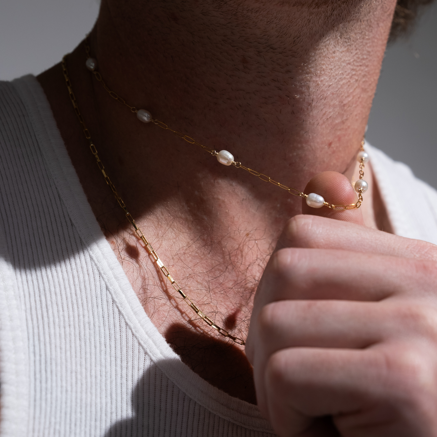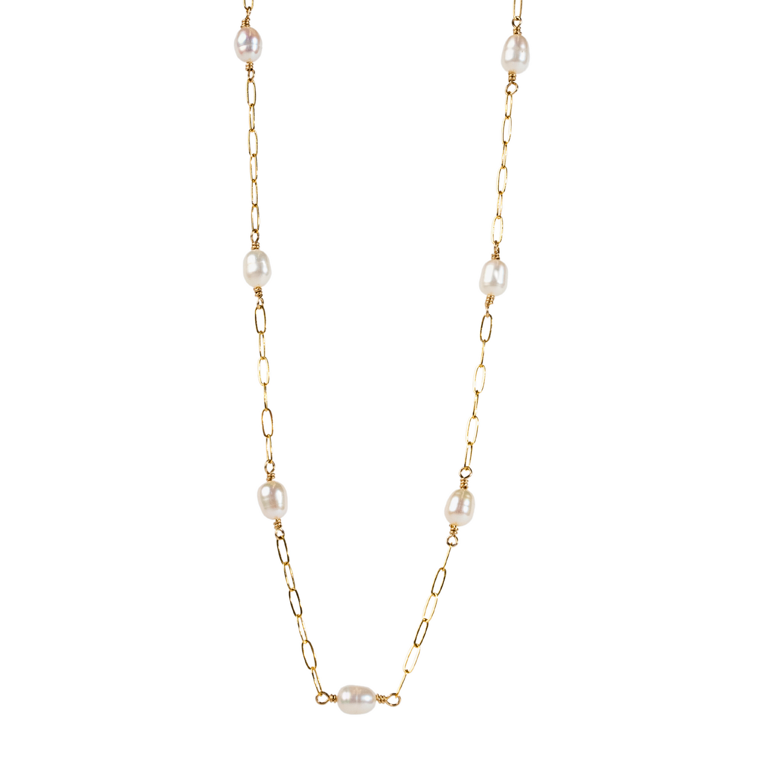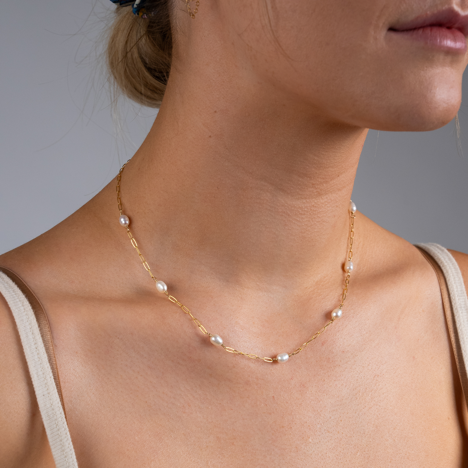 Freshwater rice pearls spaced throughout a fine paperclip link necklace. Classy on its own or layered with others.